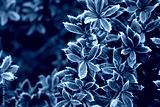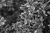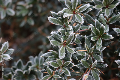 Close-up of Warty barberry bush covered bry frost on winter season. Berberis verruculosa in the garden