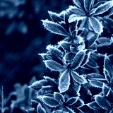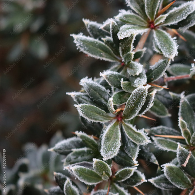 Close-up of Warty barberry bush covered bry frost on winter season. Berberis verruculosa in the garden