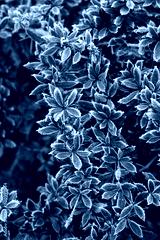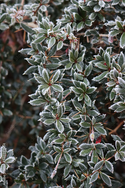 Close-up of Warty barberry bush covered bry frost on winter season. Berberis verruculosa in the garden
