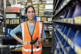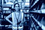 happy woman worker engineer technician staff work in factory products parts inventory warehouse storage using barcode scanner to check count part list