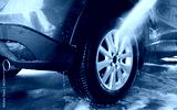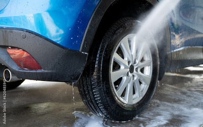 Car washing with high pressure water spray. Car cleaning. Auto care service concept. Vehicle cleaning. High pressure water spraying on car wheel and tyre. Manual car wash with high pressure water.