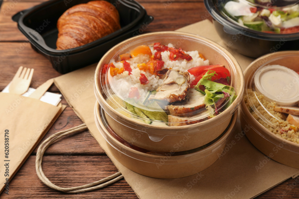 Tasty food in containers with knife and fork on wooden table, closeup