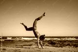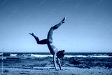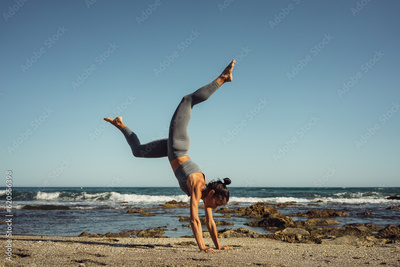 a beautiful brunette girl in gray leggings is engaged in fitness on the sand against the background of the sea