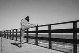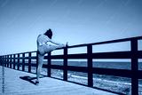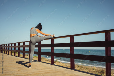 a beautiful brunette girl in gray leggings is warming up before running on the seashore