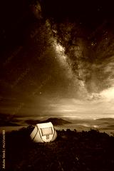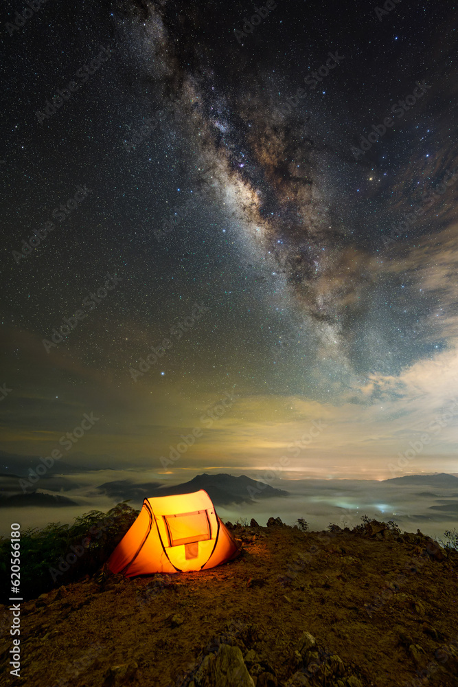 Yellow tent on top of mountain in night sky stars with Milky Way