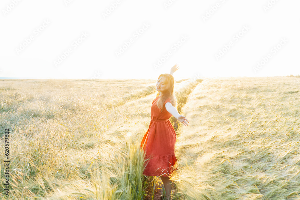 A happy young woman with raised arms relaxing in wheat field on sunset. Celebrating freedom. Positive emotions feeling life, peace of mind. Mental health practice. Nature relaxation. Selective focus.