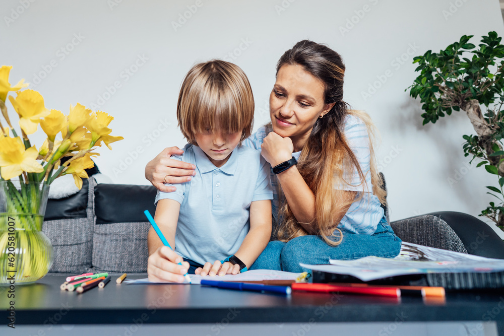 Mother and son drawing with color pencils and markers in the living room. Smiling mother has fun playing paint on paper with son on home family weekend, children creativity concept. Selective focus