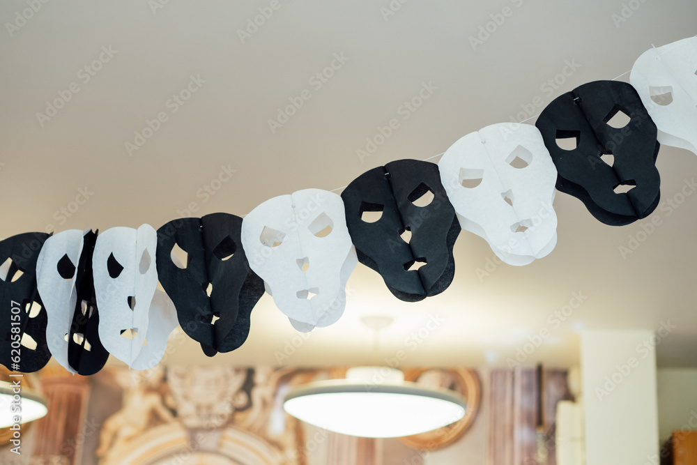 Festive garland with paper scull shape hanging inside. Halloween holiday home decor concept. Selective focus, copy space