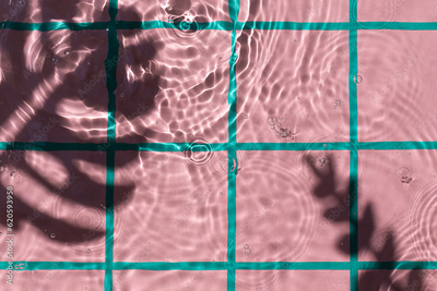 Water texture on pink checkered pattern background on the noon sunlight with tropical leaves shadow. Copy space