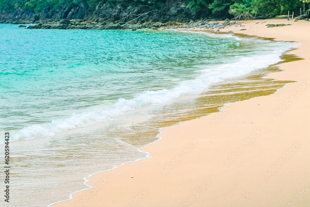 Abstract sand beach from above with light blue transparent water wave, summer vacation background, natural beauty spa outdoors.