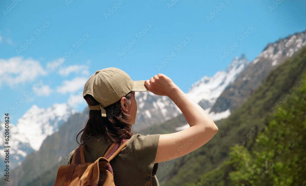 A young girl with a backpack enjoys the beauty of nature, looking at the view with outstretched arms at the top of the mountain