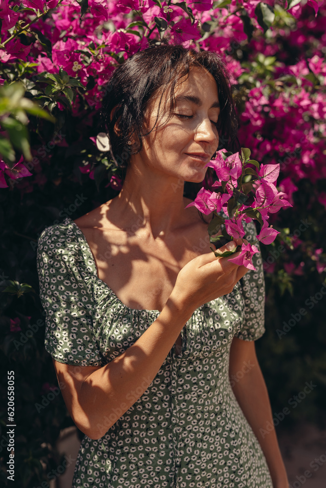 beautiful brunette girl in a green dress posing on the street of the old city. model posing on a summer sunny day.