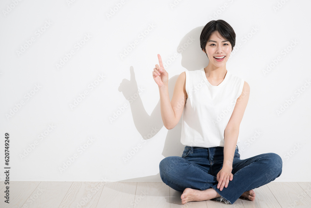 夏のイメージな爽やかで美しい女性 カメラ目線 左にコピースペースあり 指を差すポイント
