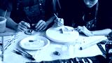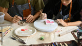 Cropped shot of man decorating clay plate on table at ceramic workshop. Indoors lifestyle activity and hobbies concept