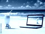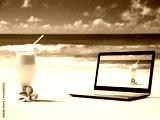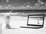 notebook on the beach and glass of fresh jucie