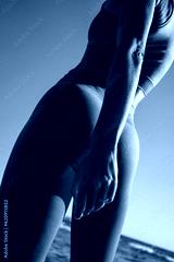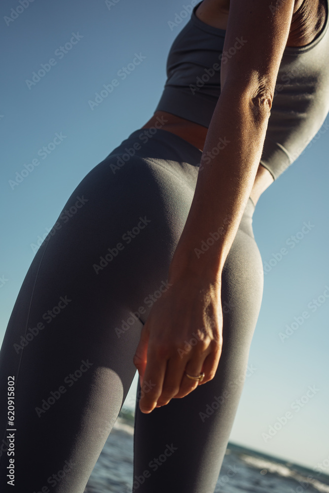 beautiful athletic female figure in a gray tracksuit on the background of the sea