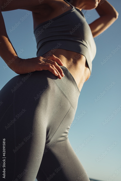 beautiful athletic female figure in a gray tracksuit on the background of the sea