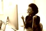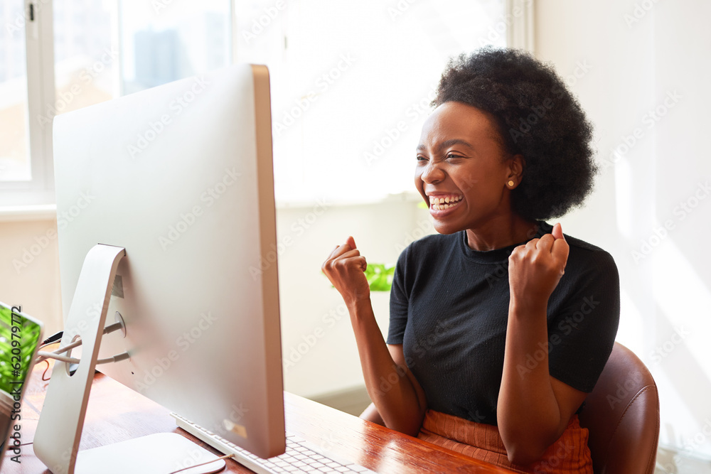 Beautiful young Black woman in tech cheers, celebrate successful mobile app
