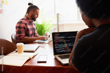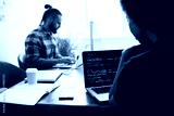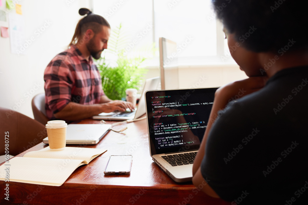 Over the shoulder shot of young woman developer typing code on laptop in office