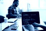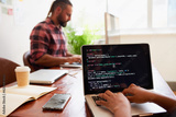 Over the shoulder shot of young woman developer typing code on laptop in office