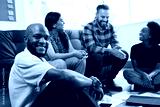 Group of diverse colleagues brainstorm together, informal meeting sit on floor