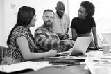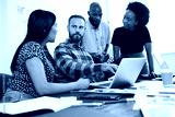 Serious team of developers brainstorming new app idea in boardroom meeting