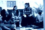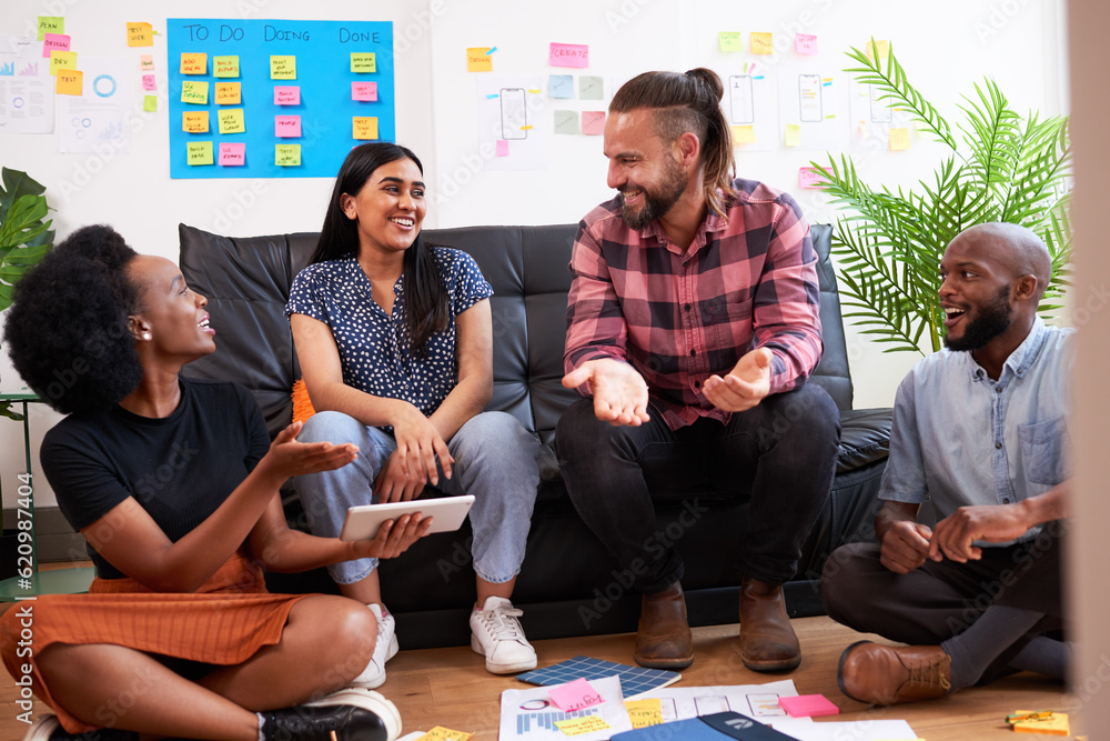 Group of diverse colleagues brainstorm together, informal meeting sit on floor