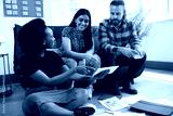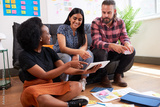 Group of diverse colleagues brainstorm together, informal meeting sit on floor