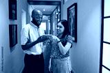 Two colleagues stand in passage hallway, discussing work with digital tablet