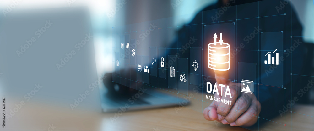 Cloud computing data management technology system for computer network cyber security or database file document transfer and sharing, big data for finance data analytics to growth concepts.