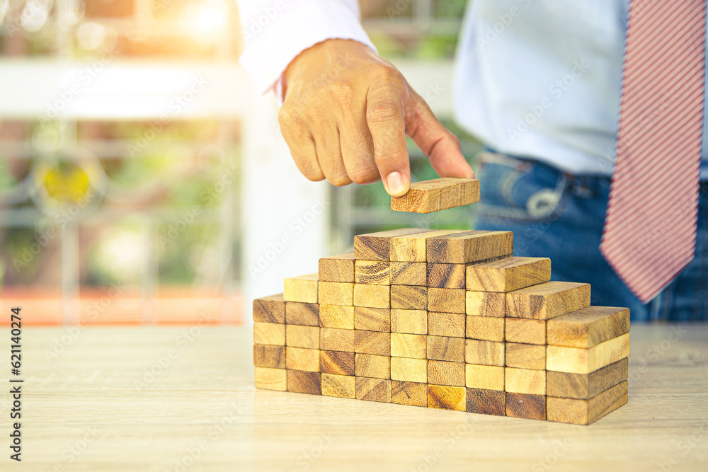 Hand placing wooden block tower stack in pyramid stair step with caution to prevent collapse or crash concepts of financial risk management and strategic planning and business challenge plan.