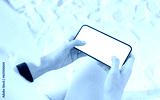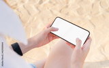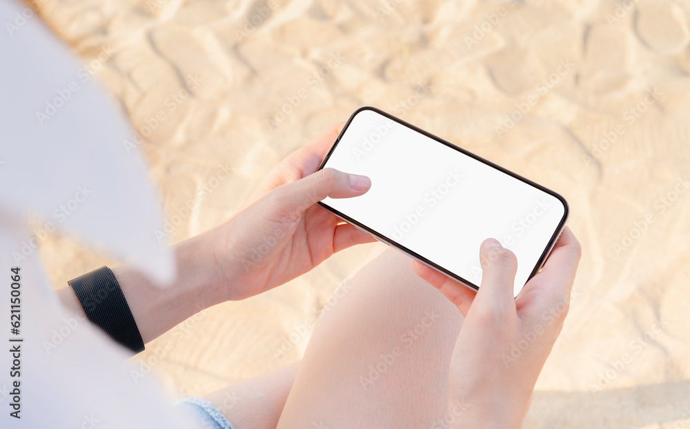 Hand holding smartphone on the beach, mobile mockup of blank screen, Take your screen to put on advertising. Summer vacation concept.