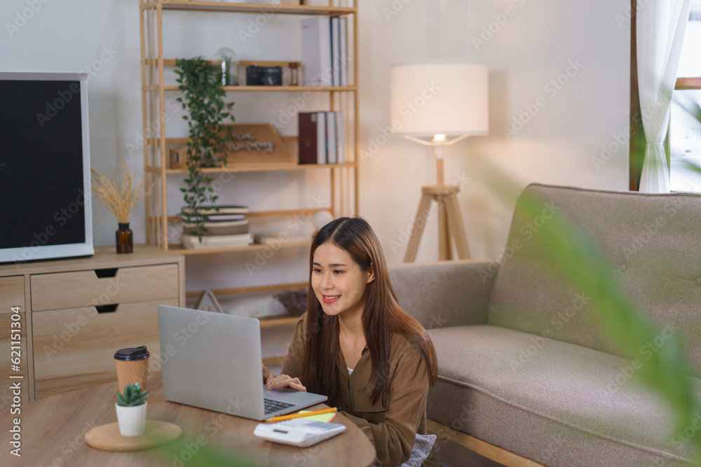 Working at home concept, Female freelance is sitting on the floor to typing business data on laptop