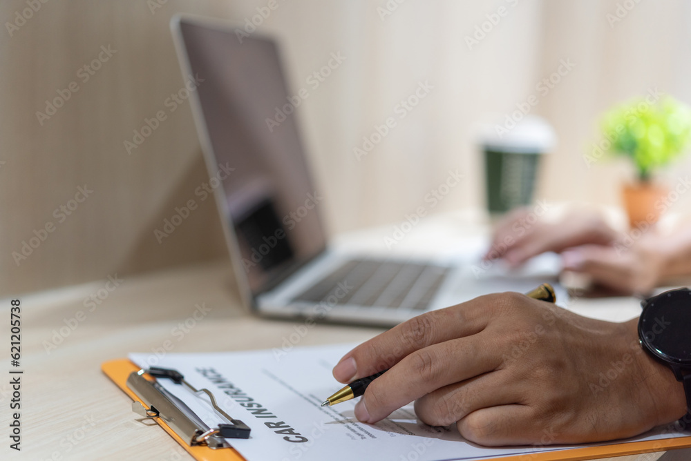 Man signing car insurance document contract agreement . Buying or selling new or used vehicle.