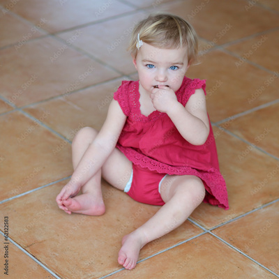 Happy toddler girl eating cookie sitting cozy on a tiles floor