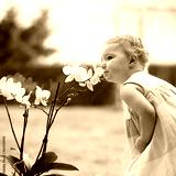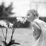 Sweet blonde curly toddler girl smelling beautiful orchid