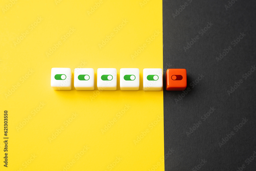 One of the switches is off. The enabled switch button among disabled ones. Permission settings. Options management. Breakage or error. Failure of one of the systems. Security threat.