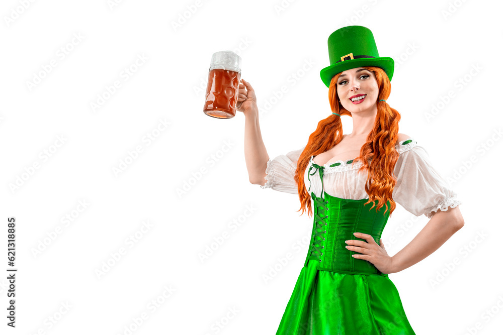 Happy Irish girl holding big mugs with beer or ale. Young red-haired woman аs green Leprechaun elf character for advertising. St. Patrick's Day party. Ireland National Independence Day March 17th
