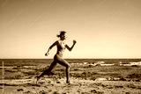 a beautiful brunette girl in gray leggings is engaged in fitness on the sand against the background of the sea