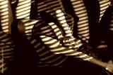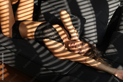 Beautiful woman in lingerie on the sofa in the light of the blinds.