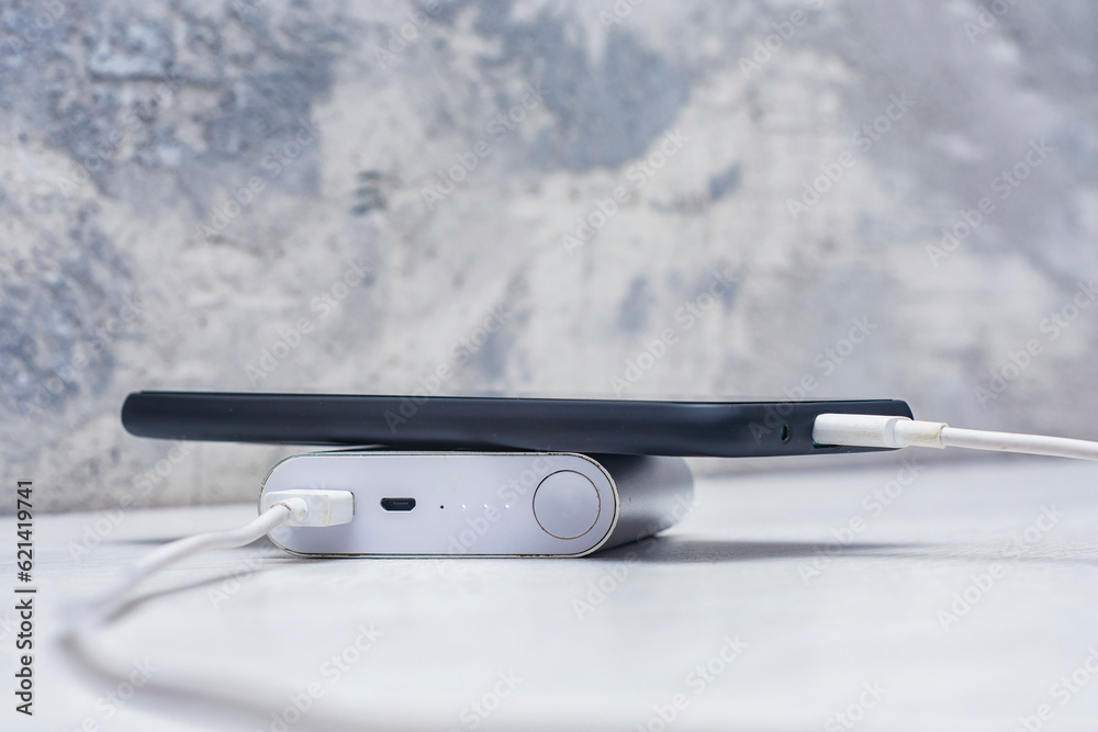 Smartphone charging with power bank on a gray wooden table. Portable charger for charging devices.