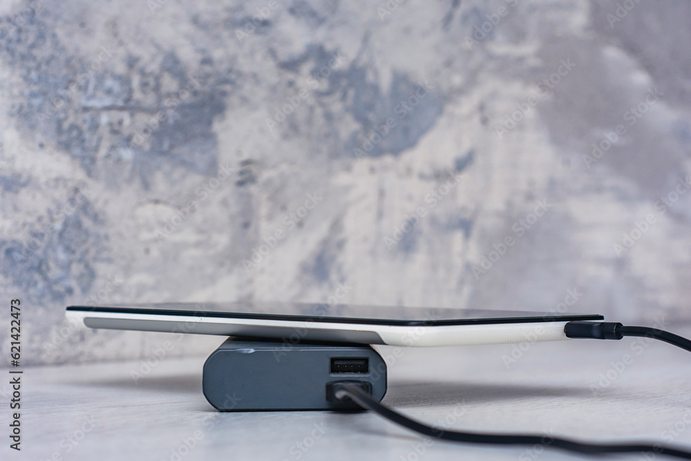 The Tablet is being charged using a portable charger on a wooden table.