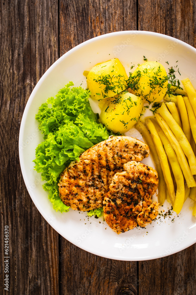 Top-down shoot of grilled chicken breasts with yellow beans and boiled potatoes on wooden table