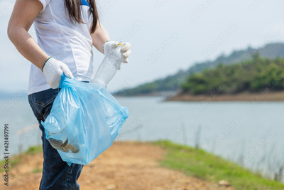Close up blue garbage bag. Female volunteers holding garbage bag, conducting environmental cooperation, saving world reducing global warming, Clean plastic bag waste in natural attractions.