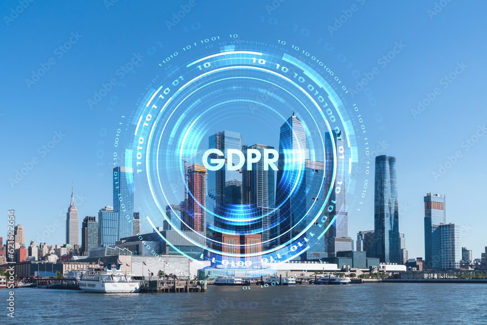New York City skyline from New Jersey over the Hudson River towards the Hudson Yards at day. Manhattan, Midtown. GDPR hologram, concept of data protection, regulation and privacy for all individuals