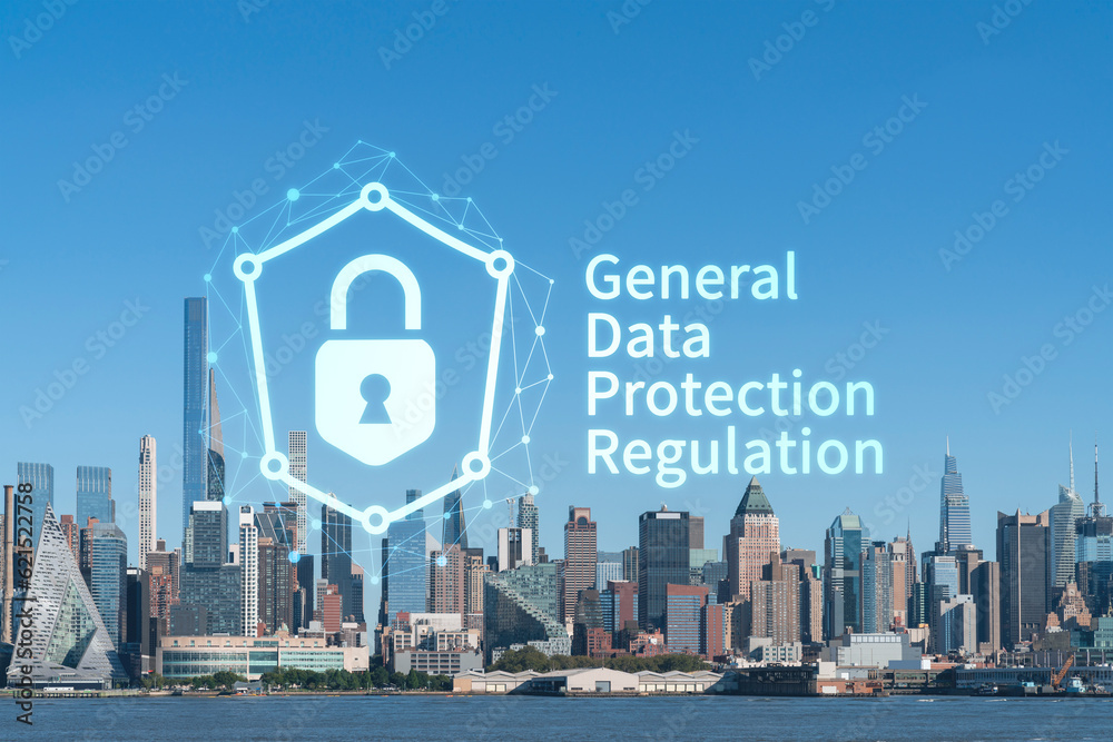 New York City skyline from New Jersey over the Hudson River towards Midtown Manhattan at day time. GDPR hologram, concept of data protection, regulation and privacy for all individuals
