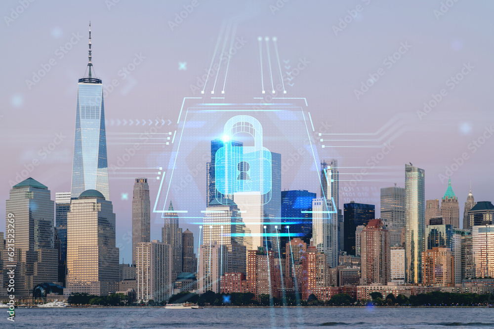 Skyline of New York City Financial Downtown Skyscrapers at sunset. Manhattan, NYC, USA. View from New Jersey. The concept of cyber security to protect confidential information, padlock hologram