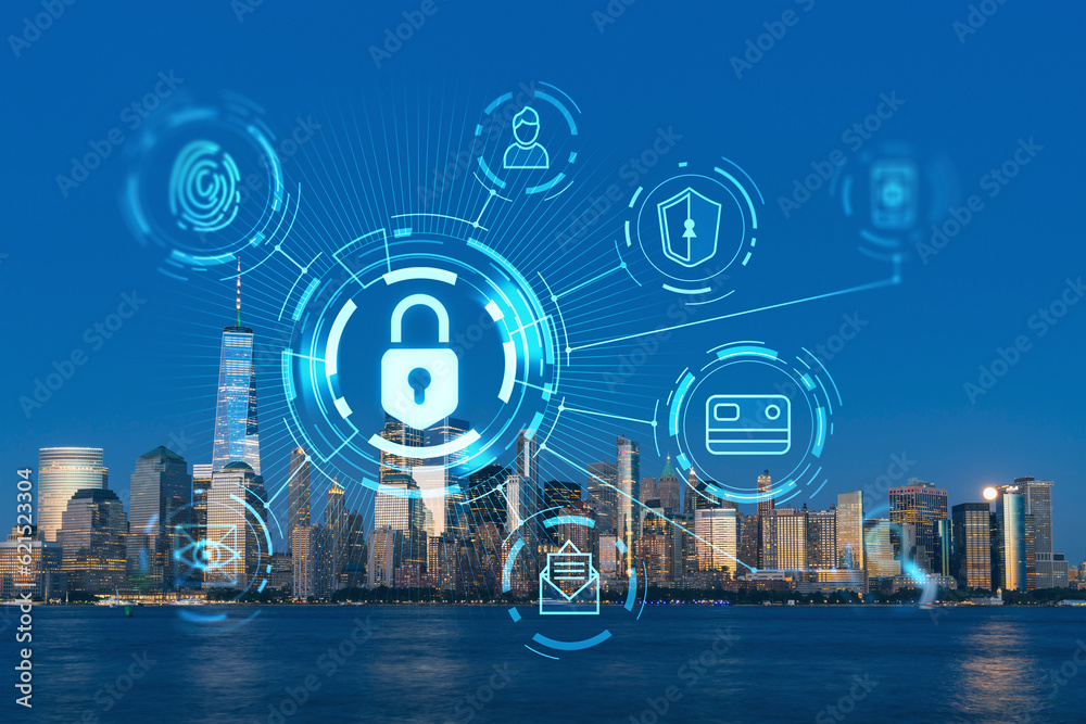 Skyline of New York City Financial Downtown Skyscrapers at night. Manhattan, NYC, USA. View from New Jersey. The concept of cyber security to protect confidential information, padlock hologram