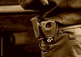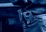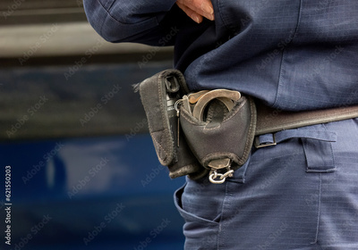 One single anonymous policeman, police officer in a blue uniform, equipment closeup, handcuffs, pepper spray detail up close. Public security service symbol, simple abstract concept, one person