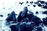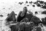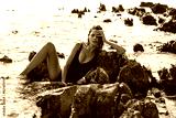 Sensual photo shot of beautiful brunette on the rocky beach area.